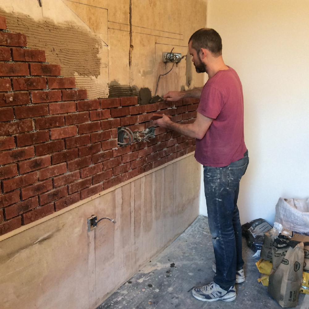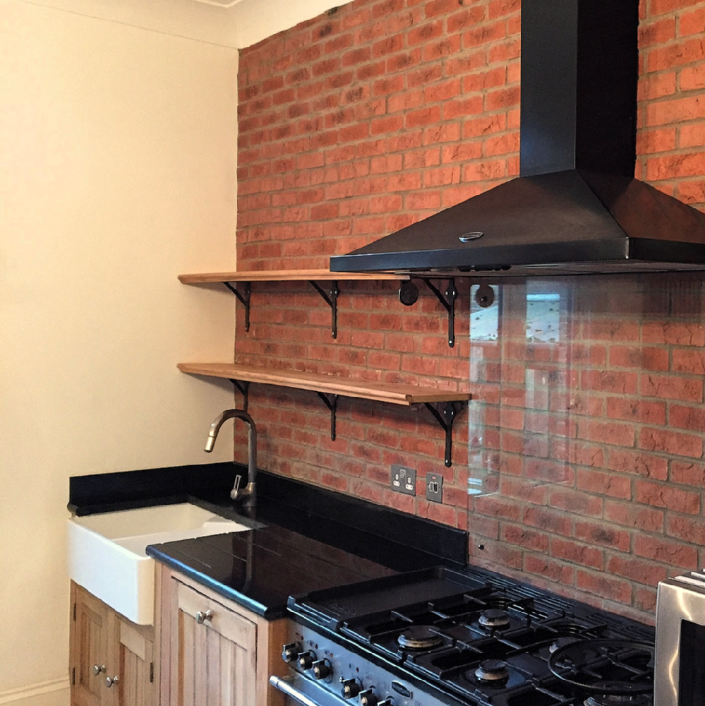 Brick slips fixed to wall and pointed - and new shelves fitted.